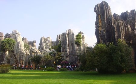 早餐后乘车,游览喀斯特奇观—【石林】风景区(150分钟),聆听每一块石头向您述说的故事,游览阿诗玛化身石,剑峰池、望峰亭, 双鸟渡食、石林湖、石林等景点,后返回市区参观【国贸中心】或【七彩云南】了解雪花银文化及普洱茶文化,晚乘卧铺火车赴大理。